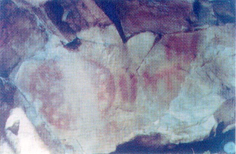 C.B.I -A 60 cm del suelo, grupo formado por un esteliforme o disco con 9 huecos en el interior y 17 en el exterior, que en origen pudieron ser 12 y 24. Encima un ramiforme, debajo 4 barras verticales ya derecha dos barras verticales seguidas de una figura zoomorfa, que semeja un ciervo o una cabra montesa.